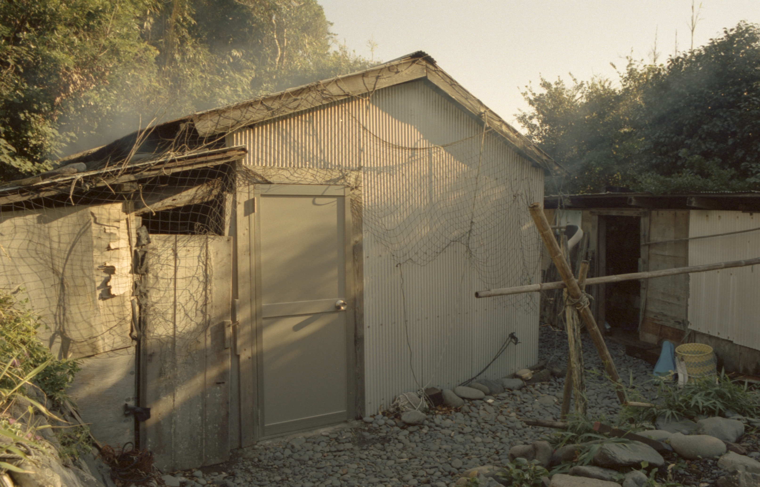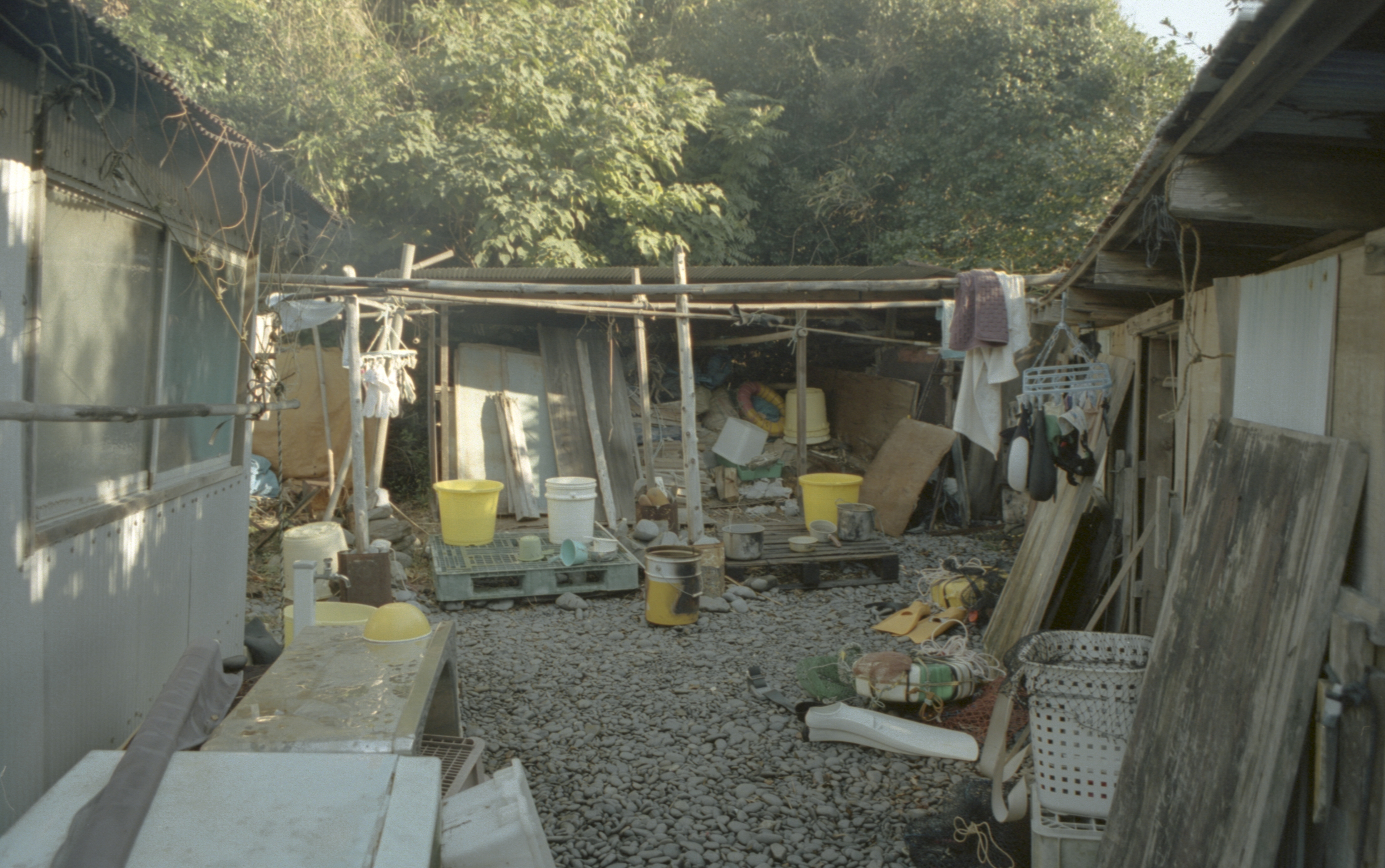 Behind some patches of vegetation lies the ama-goya, a hand-built hut constructed from reclaimed materials. This is where the ama gather and prepare before and after fishing expeditions. The style of the huts can vary depending on the group or community they belong to, but some features are common to all: a space reserved for fire is always present in the center of the room, and a gap runs all around the structure between the roof and the walls, allowing smoke to escape.