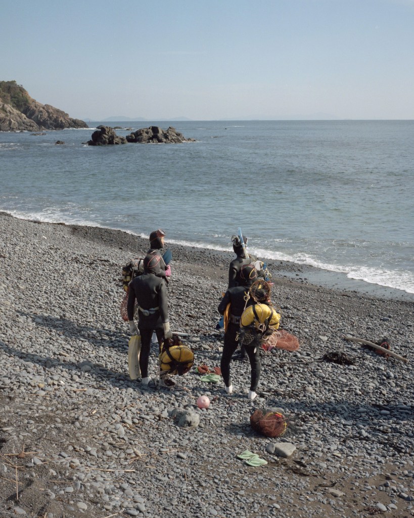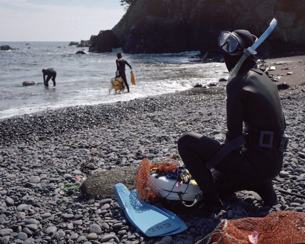 Watching them during preparations, one realizes that they don’t place much importance on aesthetics or the condition of their equipment: old rubber fins, sponge socks instead of proper footwear, handmade and well-worn wetsuits. The older ama use masks from the 1960s with large lenses that cover their faces from their foreheads to their upper lips. After the preparations are complete, they all walk together to the seaside. Smiling, they enter the water and spend an hour and a half immersed in fishing. The older ones remain near the shore, in shallow waters, while the younger ones, like Rikako, venture farther out, where the seabed reaches depths between 7 and 12 meters. Their famous whistle, known as isobue, can be heard from the shore. It serves as both a decompression technique used upon resurfacing and a signal to locate each other.