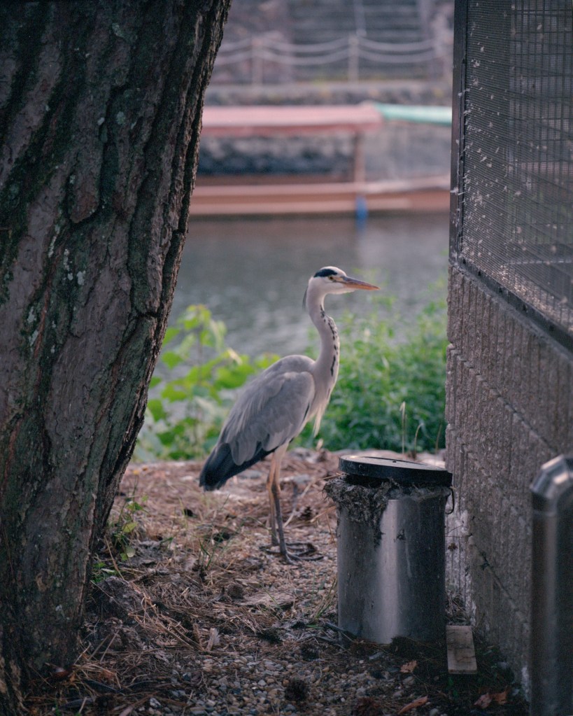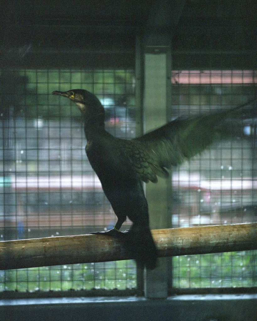 In Gifu, when we witness a Ukai session for the first time, the structure that manages the copious flow of tourists is well established and one has the feeling of taking part in an amusement park show. In Uji, on the other hand, there is a simpler, more genuine atmosphere. The volunteers who welcome tourists and guide the boats are all smiling pensioners from the area. One of them, curious about the camera, asks me where I come from. A confused chat arises in which we mix English and Japanese, often laughing to mask the embarrassment. Here I am the only Westerner to take part in the only demonstration of the day, which starts at 7.30pm and ends after an hour. Before boarding I observe one of the two fisherwomen selecting the cormorants for the hunting trip. After cleaning the aviary and the tanks, she uses baskets divided into two, in which she inserts two specimens to transport them on the boat. The girl doesn’t rush the process, she caresses them one by one, some seem to draw her attention by placing their beaks on her in exchange for a caress on the muzzle. When one of them does not want to enter the basket, flapping its wings in protest, she does not force the animal and releases it, looking for a volunteer among the others. While I observe the scene, a heron approaches the aviary, attracted by the fish that the trainer throws to her army of cormorants. Between the two it is obvious that the one who is outside is in the right place but I wonder if the relationship between the cormorants and her cannot at least partially satisfy them too. While she caresses the muzzle of a specimen that presses its skull against her belly, I meet its gaze. I see my reflection inside and think of the legends of men trapped in the bodies of animals, and their ambiguous role as warners and oppressed.