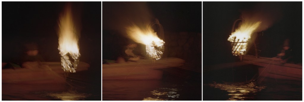 La barca si ferma al centro del fiume, dove la curva rallenta la corrente. Il timoniere getta la piccola àncora parcheggiando dietro due imbarcazioni identiche. Su ognuna ci sono una ventina di curiosi, attendono pazienti in silenzio l’inizio dello spettacolo. Il sole è quasi sparito oltre l’orizzonte. Tento di indovinare quale sarà la posizione migliore per fotografare la scena, mentre allungo e ripiego le gambe cercando una posizione più comoda. Gli occhi si stanno ancora adattando al buio che velocemente ha reso lo spazio attorno un confuso miscuglio di blu quando dal nulla una fiamma ci scorre a fianco. Una palla di fuoco vola sulla superficie dell’acqua seminando scintille che si spengono nel loro riflesso.