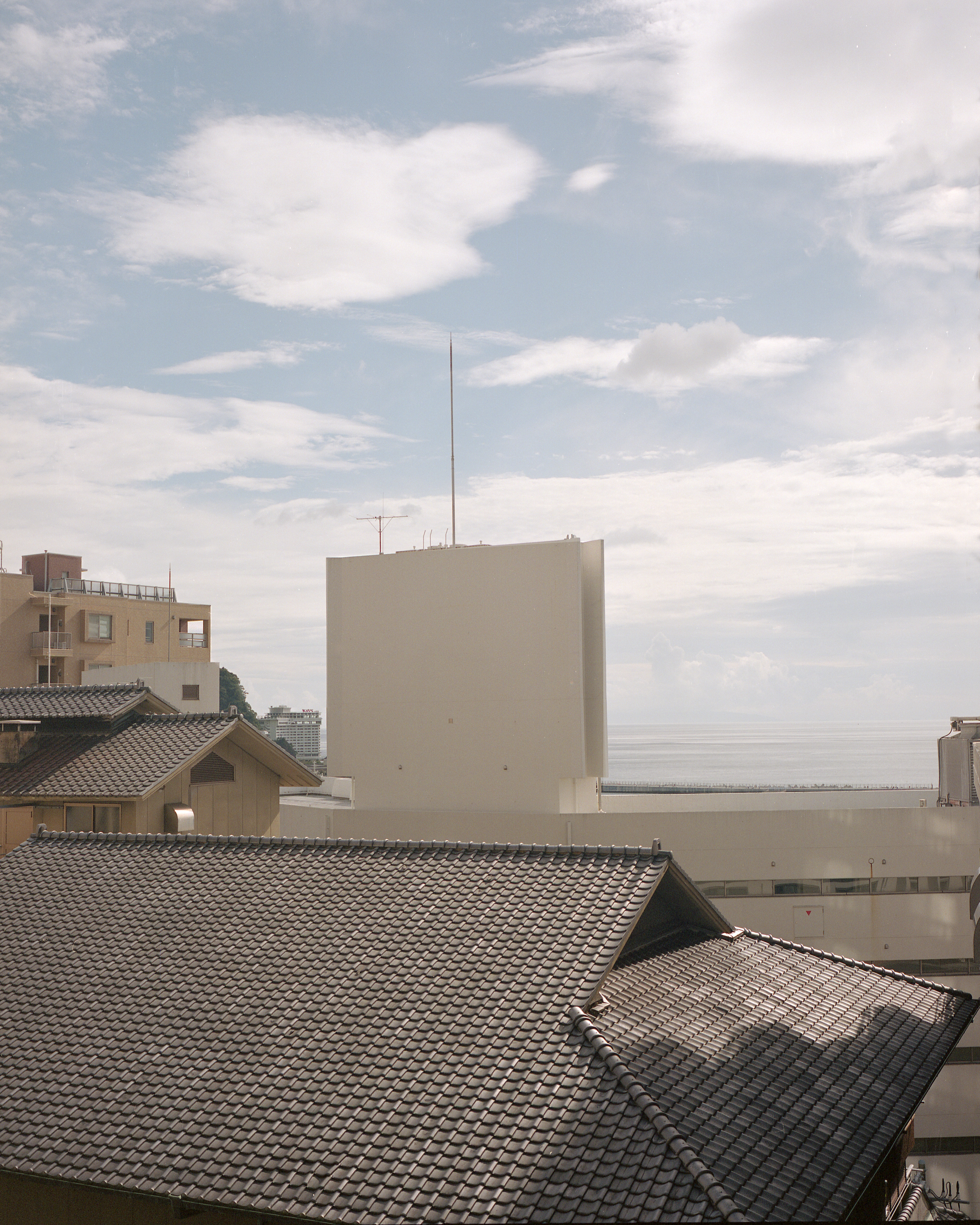 I crossed the hotel lobby, carpeted in orange with patterns of leaves and flowers in various colors. The ceiling was covered with small transparent cylinders that filtered a warm yellow light. At the end of the hall, a huge window opened onto the garden. After completing the long welcoming ceremonies, I made my way to my room. The corridor leading to the elevators wound back and forth, intertwined with a stream. I assumed it came from the garden. I watched the carp, which were motionless, clustered in a bend just in front of a vending machine. The neon light, filtered through the colorful bottle replicas, seemed to hypnotize the fish. Every detail in that place was carefully curated but seemed timeless. The elevator was no exception. I pressed the button for the sixth floor until I nearly buried the first knuckle of my finger. Nothing in that place had been updated to the digital age; everything remained mechanical and analog. I turned the key in the door with some difficulty, as the oversized keyring made it hard to handle. The room was everything I had hoped for—a typical Japanese-style room. The hotel was built in the 1930s, possibly renovated in the 1980s, but certainly not recently. Once inside, the warm smell of tatami and wood filled my senses. I looked at the telephone on the table, which, besides the rotary dial, had a red button and a white one, each with a small label in katakana indicating which one to press for reception or room service. I smiled while I examined the room, opening all the doors of the built-in storage cabinets, stepping into the space with the Toto toilet and the usual pair of small pink plastic slippers (size 36). Then I checked out the bathroom, complete with a shower and a small square tub—all lined in beige tiles—and finally stepped out onto the terrace overlooking the bay. I smiled even more as I picked up my camera and went outside, ready to explore. Just knowing I would retreat to that room after a day spent searching for new sights gave me a feeling of physical pleasure. A slight thrill ran down my spine as I crossed the lobby and stepped out into the oppressive heat of late August.